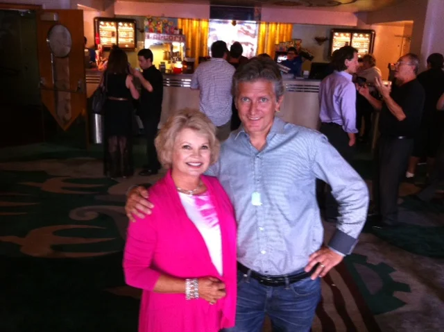 Kathy with writer-director heather Donnell at the beautiful Orinda Theatre in front of the Mom, Murder and Me poster awaiting start of film's premier showing